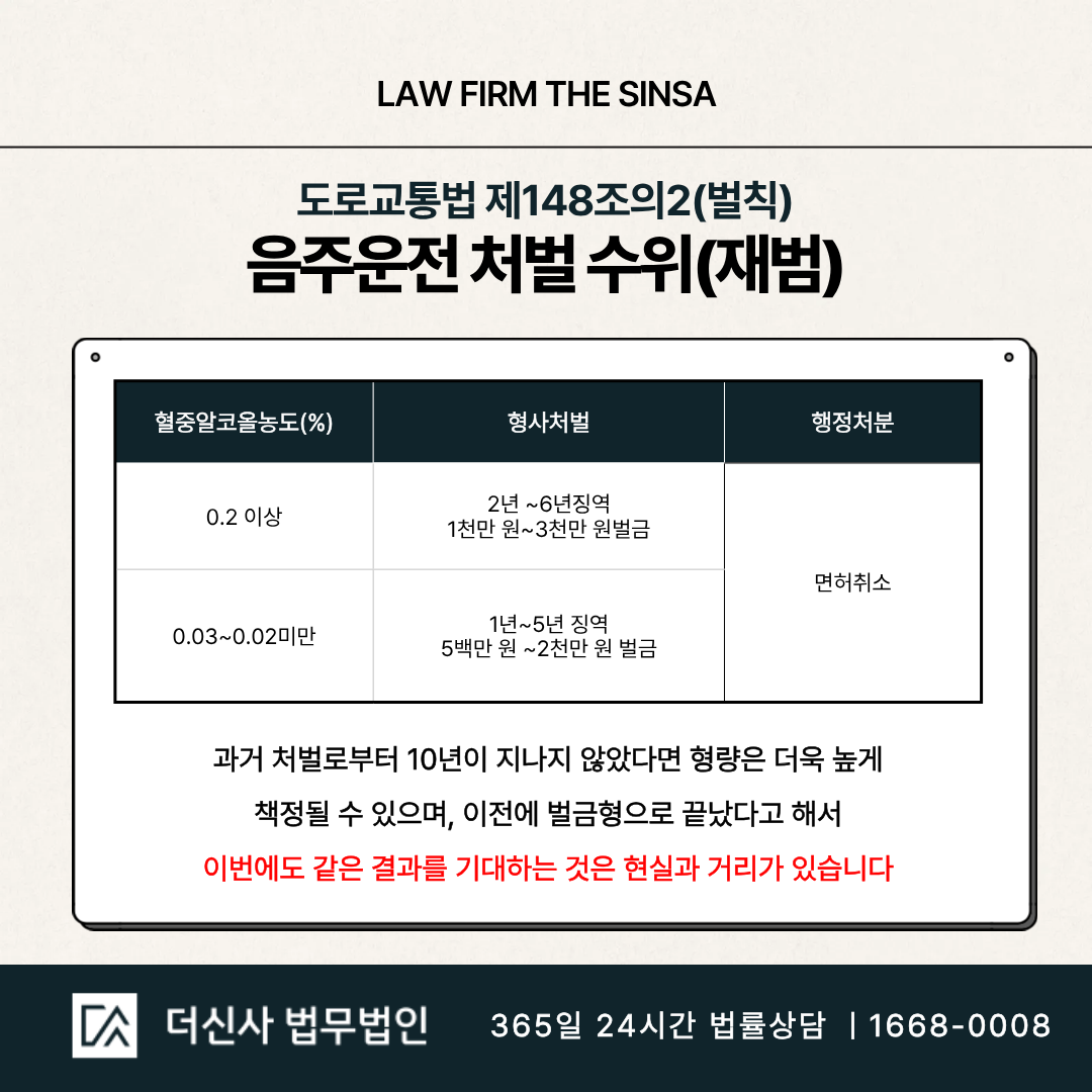 최근 10년 이내에 동일한 전력이 있다면 가중처벌 대상이 되어, 수치가 낮더라도 곧바로 구속이나 실형에 가까운 엄중한 심판을 받게 될 확률이 매우 높습니다.