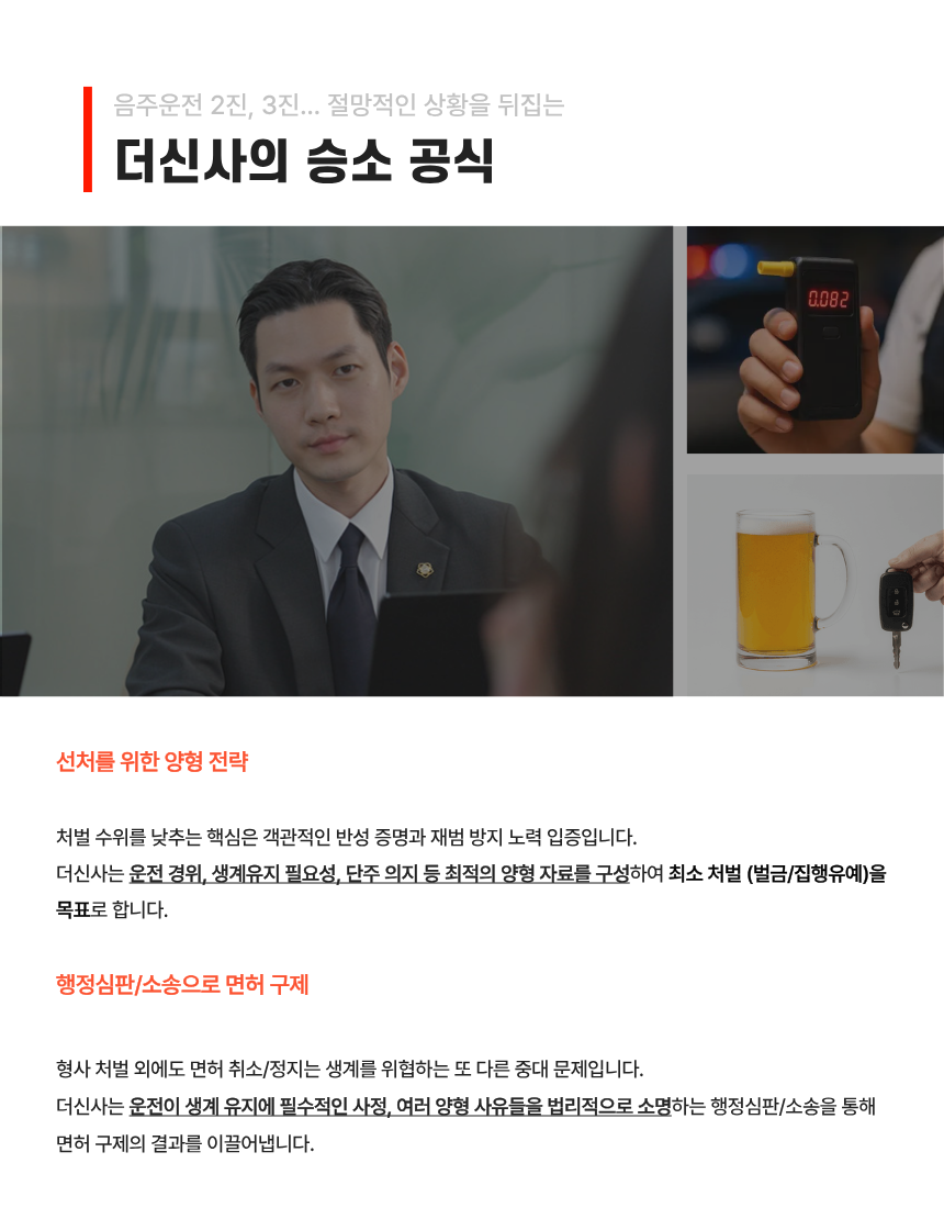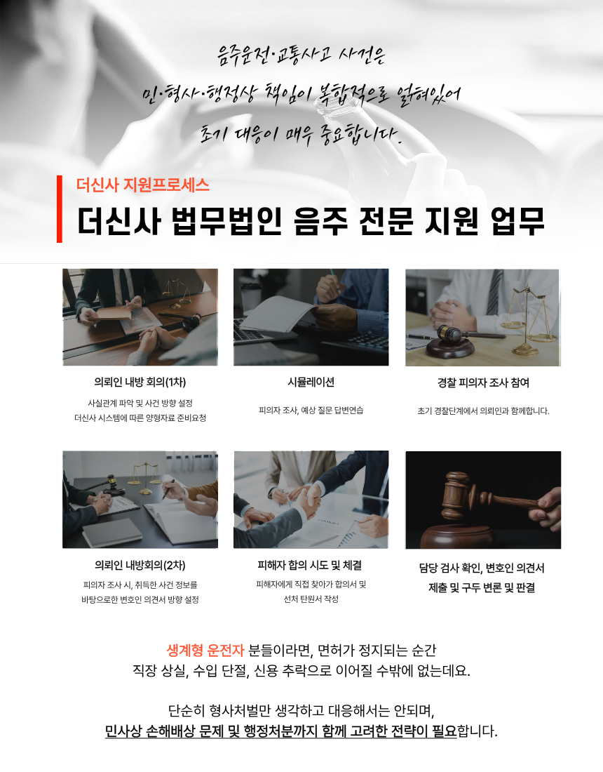 설령 골든타임을 조금 놓친 상황이라 하더라도, 더신사는 음주운전 전담 부서를 다각화하여 단계별 밀착 방어 시스템을 가동하고 있습니다.