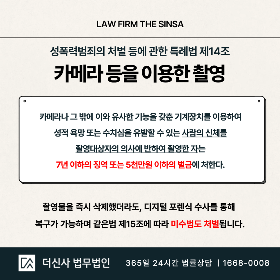 성폭력처벌법은 상대방의 의사에 반해 성적 욕망 또는 수치심을 유발할 수 있는 신체를 촬영하는 행위를 명확히 금지하고 있습니다.
