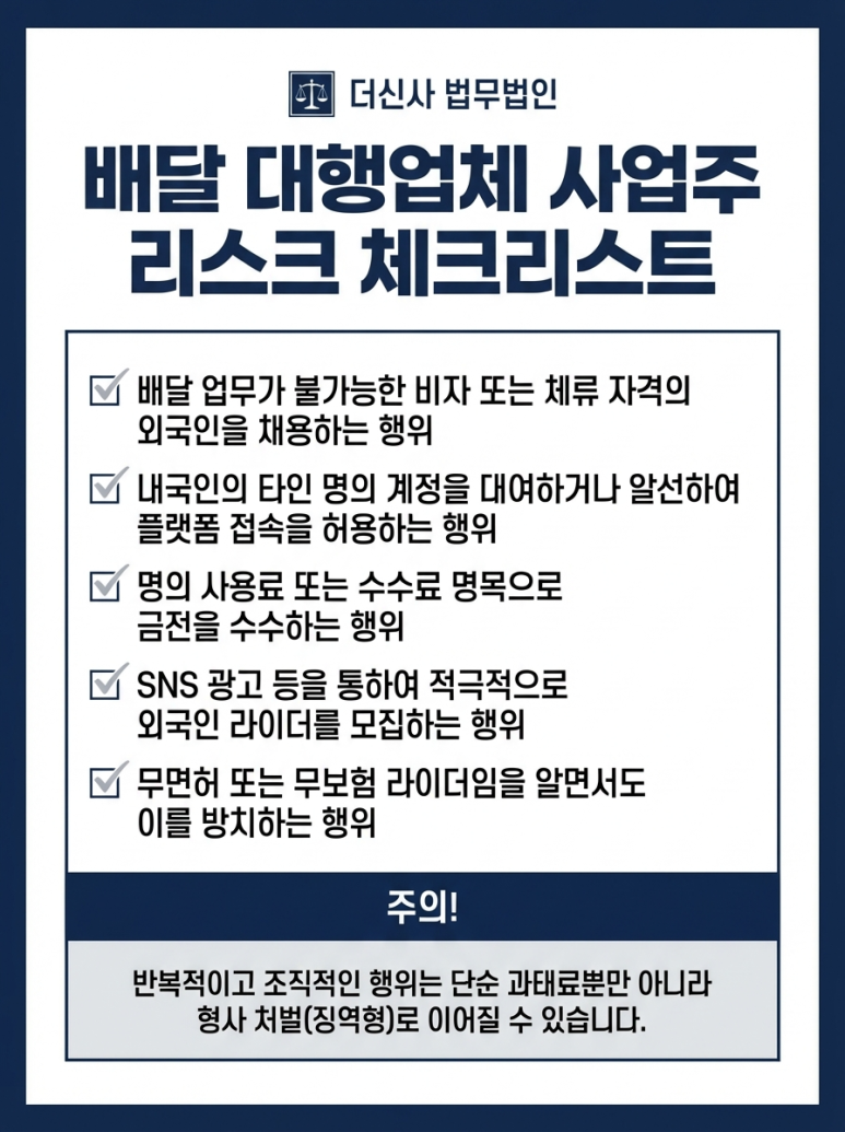 취업 자격이 없는 외국인을 라이더로 고용했거나, 한국인 명의 아이디를 빌려주는 방식으로 플랫폼 접속을 허용한 경우라면 이미 위반 상태입니다.