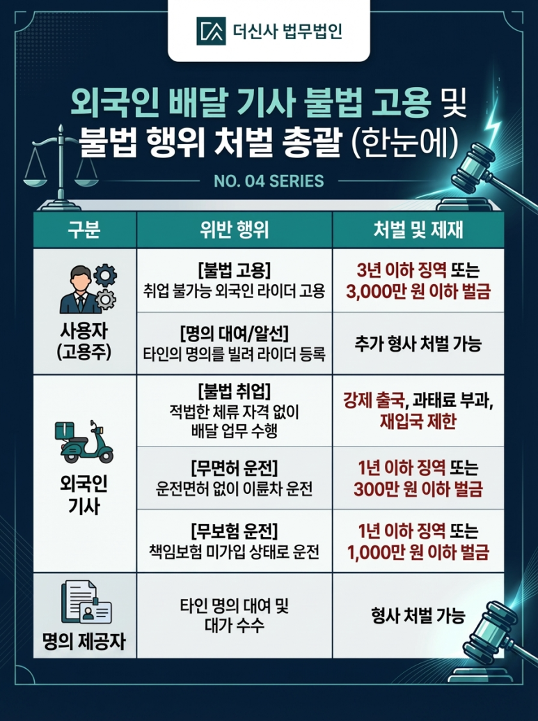 유학(D-2), 구직(D-10) 등 배달 취업이 불가능한 체류 자격으로 라이더 일을 했거나, 한국인 명의 아이디를 빌려 플랫폼 수익을 얻은 경우, 무면허 또는 무보험 상태로 오토바이를 운전한 경우라면 처벌 대상입니다.